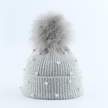 Nieuwe Fox Bont Ball Cap Met Parel Kleur Bijpassende Bontbal Warm Gebreide 3d Borduurwerk Voor Jongens En Meisjes In De Herfst En Winter