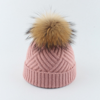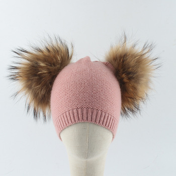 Kinder Herfst Winter Wasbeer Bont Dubbele Bal Cap Hoogwaardig Konijn Fluwelen Garen 100% Wol Warm Gebreide Unisex Jongens Meisjes